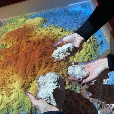 Играйте с этой интерактивной песочницей, которая представляет собой трёхмерную топографическую карту и воспроизводит рельеф местности. Пересыпайте песок по своему усмотрению и создавайте свою собственную карту.